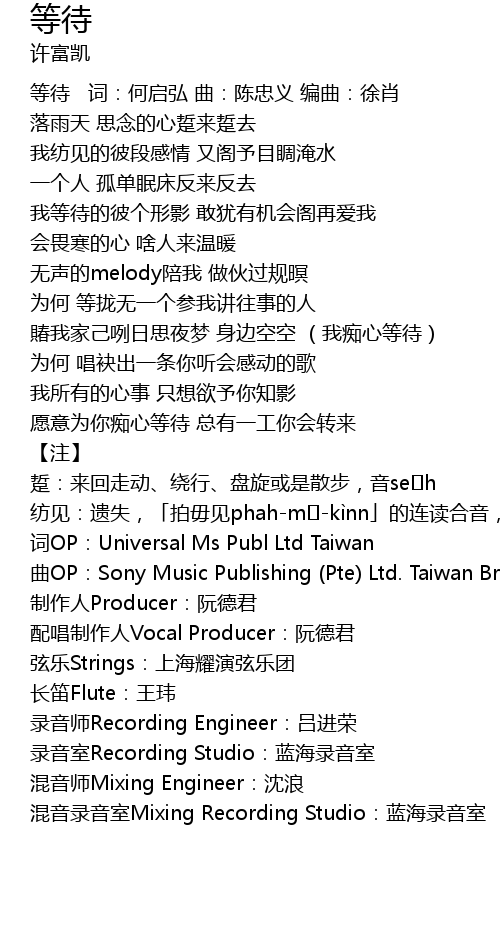 | 等待 词:何启弘 曲:陈忠义 编曲:徐肖 | |