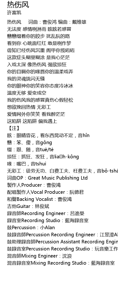 | 热伤风 词曲:曹俊鸿 编曲:戴维雄 | |
