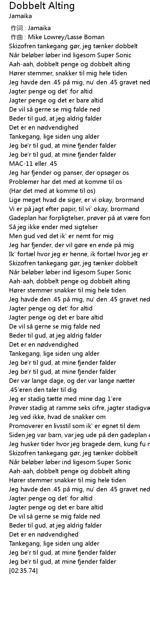 | [02:33.41] | Jeg be' r til gud, at mine fjender falder |