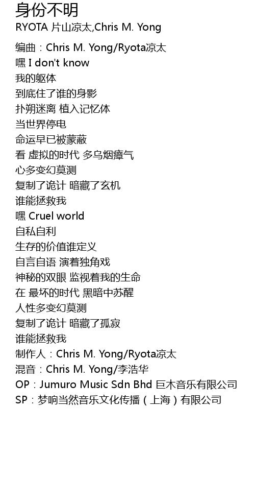 | [02:35.64] | 制作人:Chris M. Yong/Ryota凉太 |