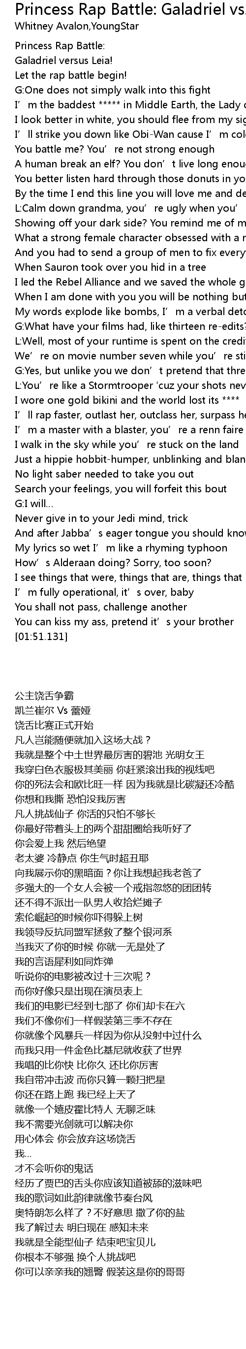 | Song | Princess Rap Battle: Galadriel vs. Leia |