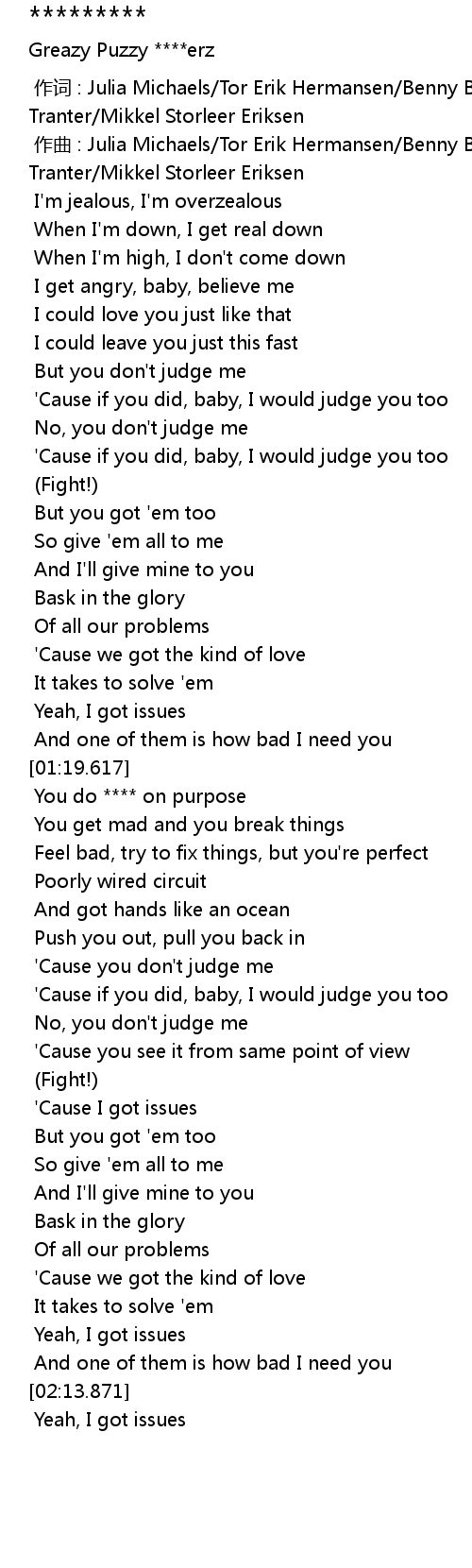 | [00:01.000] | 作曲 : Julia Michaels/Tor Erik Hermansen/Benny Blanco/Justin Drew Tranter/Mikkel Storleer Eriksen |