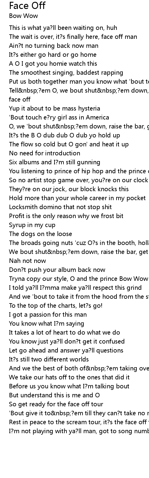 | Tell ?em O, we bout shut ?em down, raise the bar, get ready for the face off | |