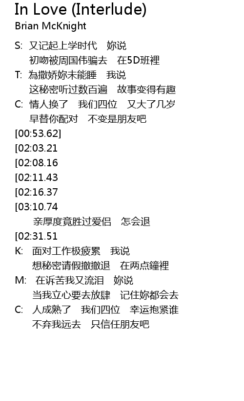 | [01:49.62] | C: 人成熟了 我们四位 幸运抱紧谁 |