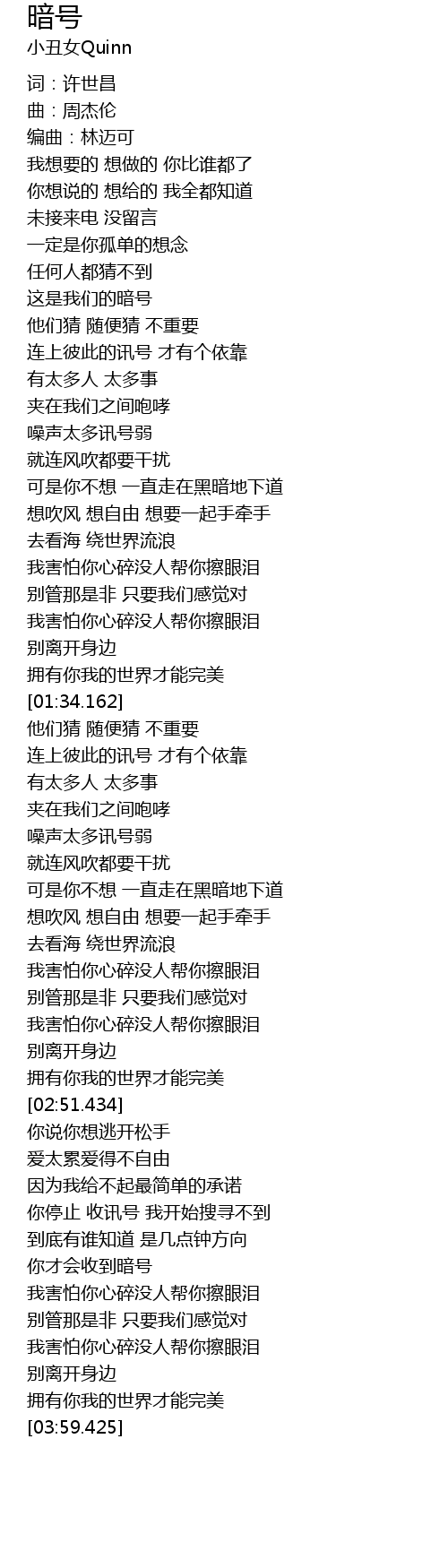 | [00:34.291] | 连上彼此的讯号 才有个依靠 |