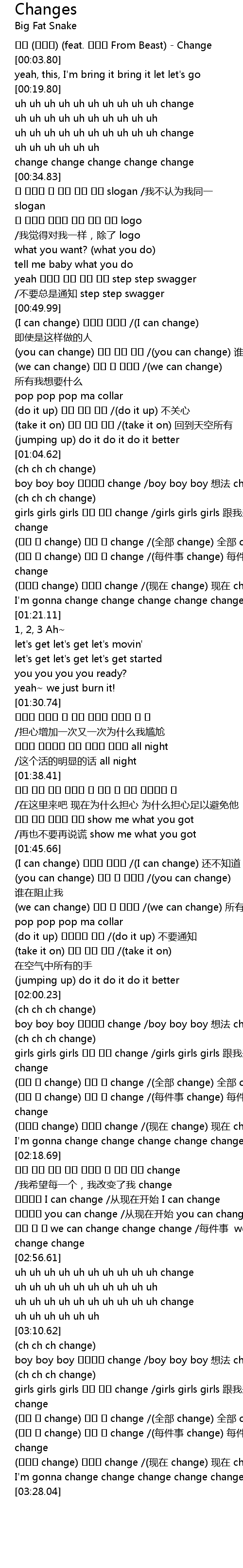 | [02:10.50] | (모두 다 change) 모두 다 change /(全部 change) 全部 change |