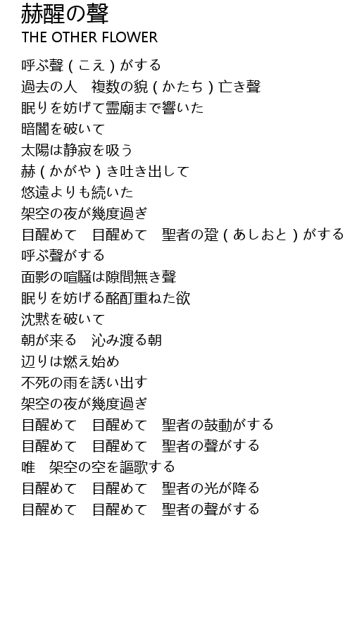 | [01:01.44] | 目醒めて 目醒めて 聖者の跫(あしおと)がする |
