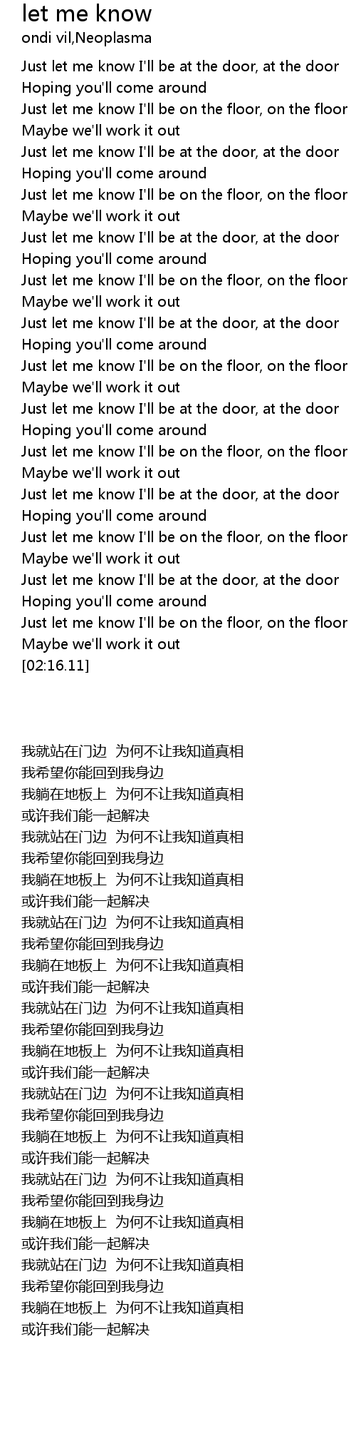 | [01:38.61] | Just let me know I'll be at the door, at the door |