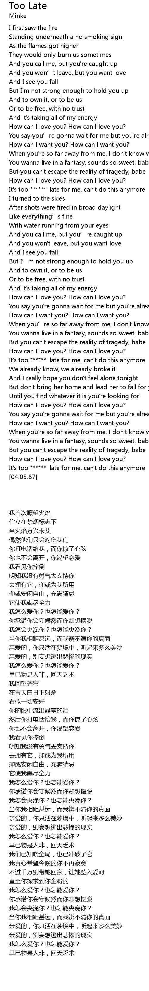 | [04:00.82] | It's too ******' late for me, can't do this anymore |