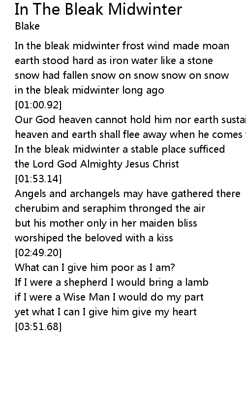 | [00:06.19] | In the bleak midwinter frost wind made moan |