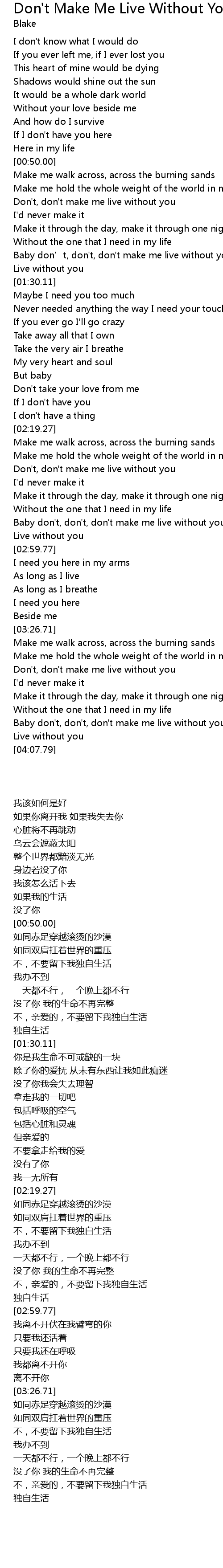 | [02:48.50] | Baby don' t, don' t, don' t make me live without you |
