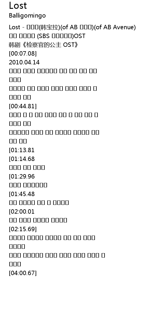 | [00:01.37] | Lost - 한보라(韩宝拉)(of AB 에비뉴)(of AB Avenue) |