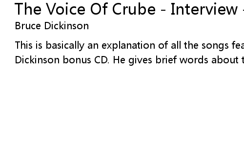 | This is basically an explanation of all the songs featured on The Best Of Bruce Dickinson bonus CD. He gives brief words about the songs. |