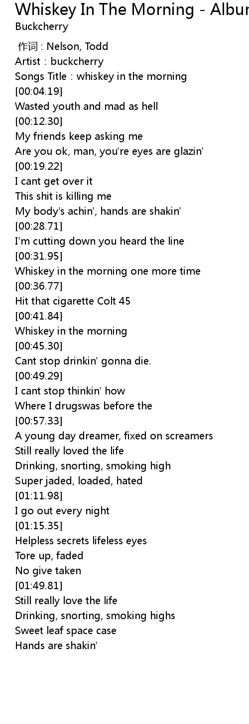 | [00:01.68] | Songs Title: whiskey in the morning |