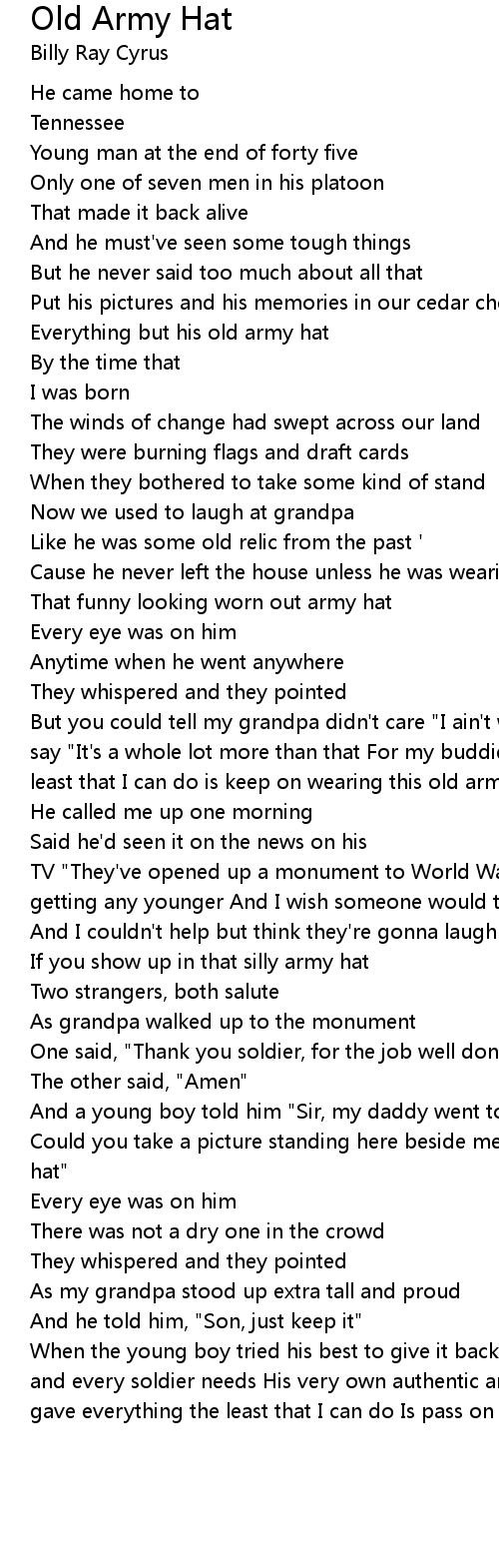 When the young boy tried his best to give it back "You're a brave little soldier and every soldier needs His very own authentic army hat" "For your daddy who gave everything the least that I can do Is pass on this old worn out army hat"