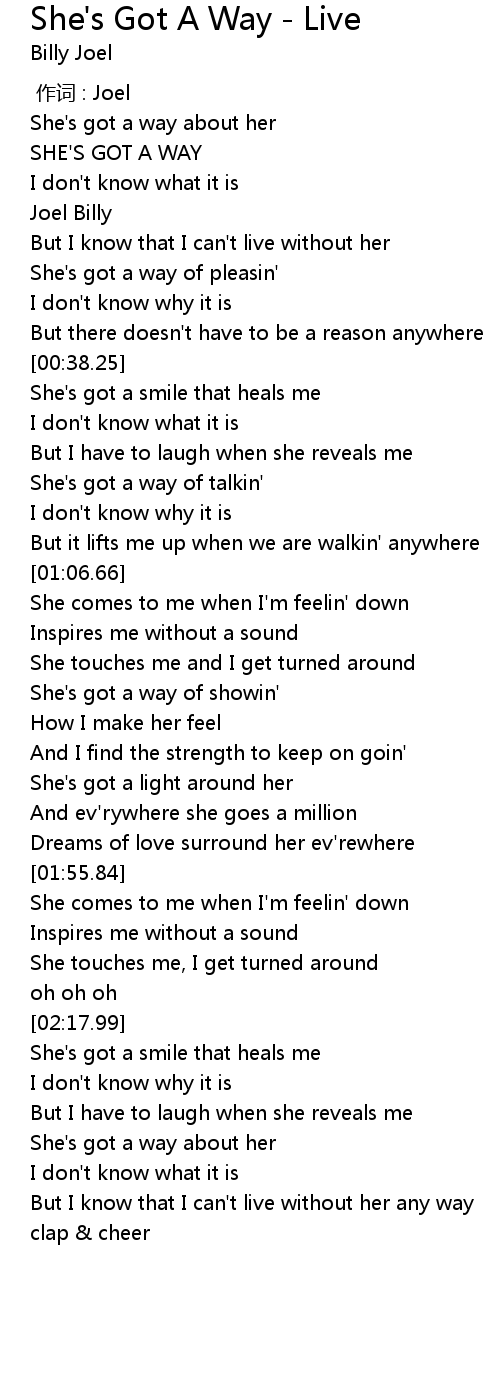 | [01:58.23] | She comes to me when I'm feelin' down |