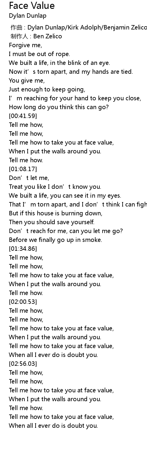 | [00:55.44] | Tell me how to take you at face value, |