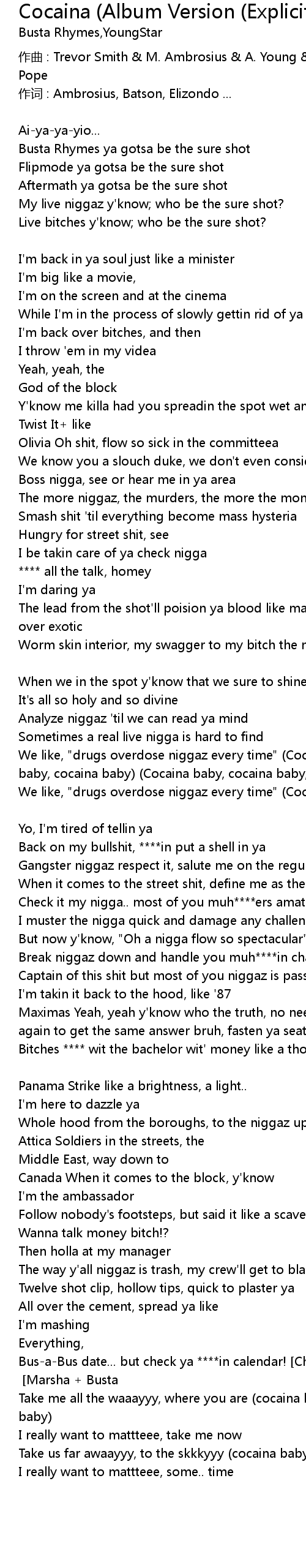 | We like, " drugs overdose niggaz every time" Cocaina baby, cocaina baby Busta Rhymes | |