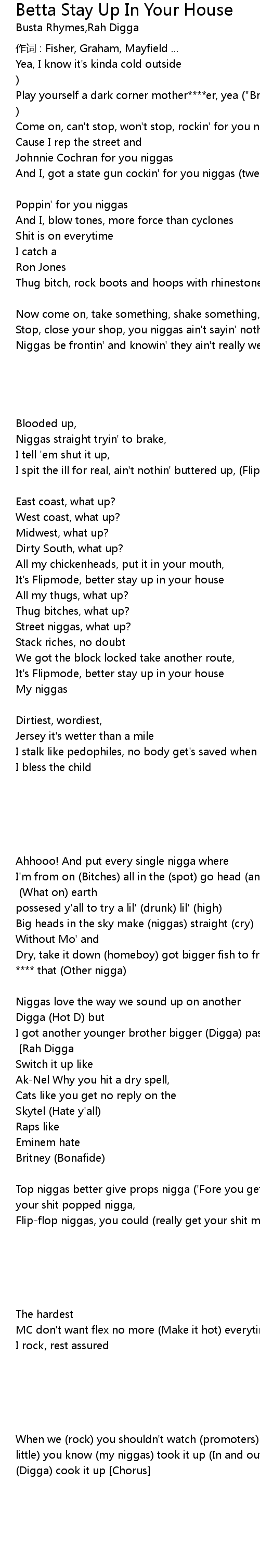 | Henny so I can take another swigger Chorus Rah Digga | |