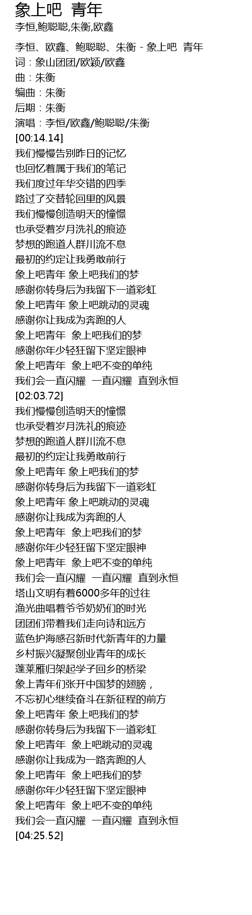| [00:00.91] | 李恒、欧鑫、鲍聪聪、朱衡 - 象上吧 青年 |