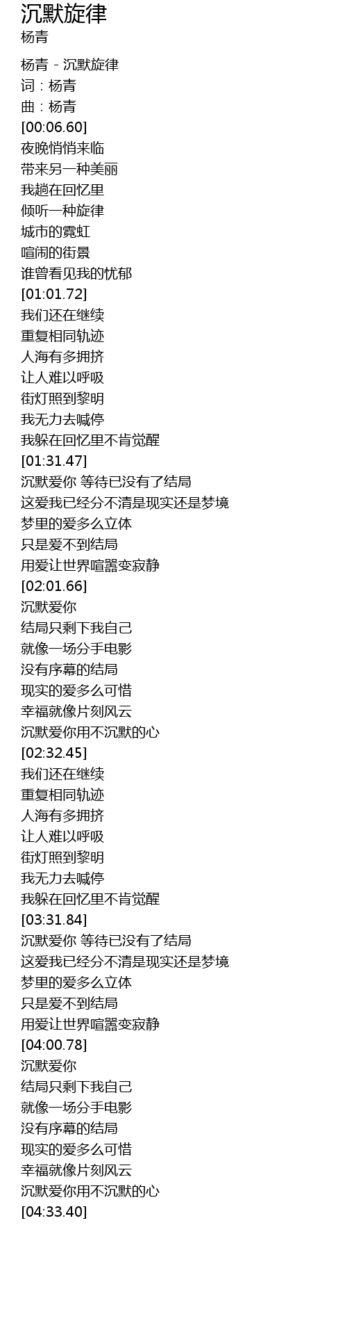 | [00:00.57] | 杨青 - 沉默旋律 |