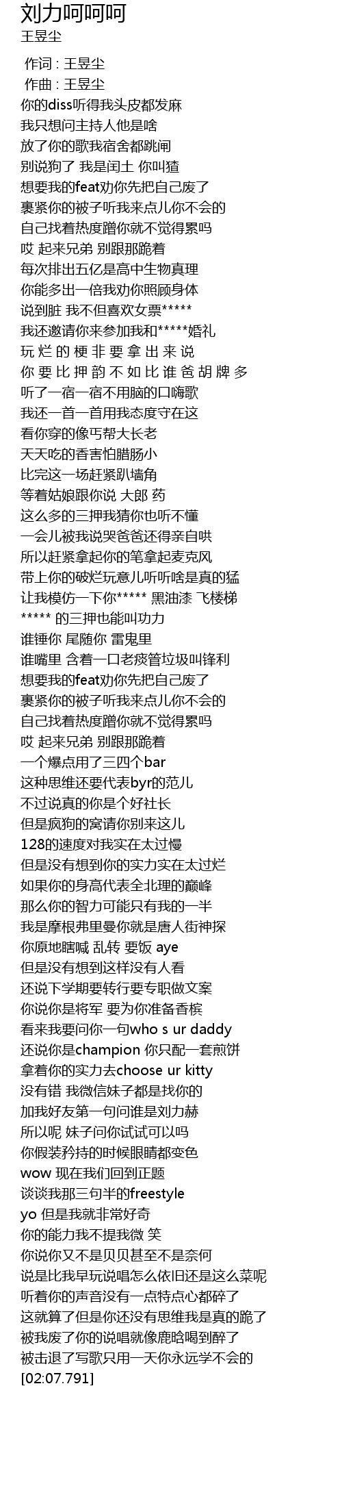 | [02:03.040] | 被我废了你的说唱就像鹿晗喝到醉了 |