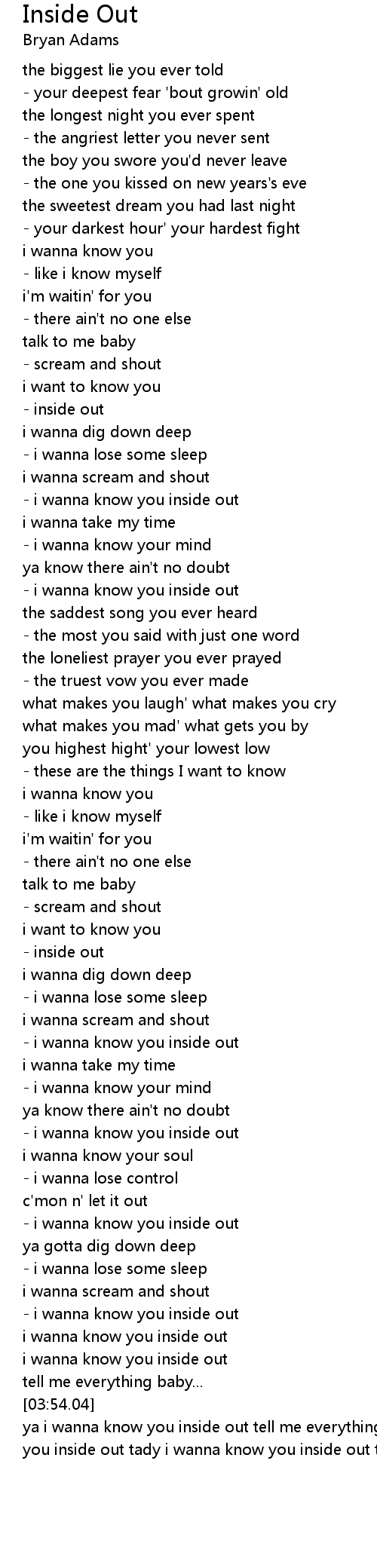 ya i wanna know you inside out tell me everything baby i wanna know you inside out tady i wanna know you inside out tell me everything |