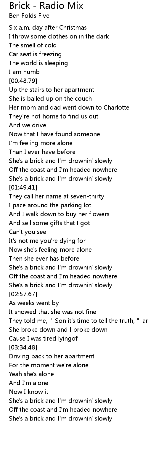 | [01:42.04] | She's a brick and I'm drownin' slowly |
