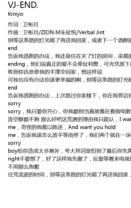 | bié děng zhè tiáo lù de dēng guāng àn le zài sòng wǒ huí jiā, huò zhě xià yī ge jiǔ zuì de líng chén, bō tōng wǒ hào mǎ, yòu zài zhěng zuò chéng shì xià qǐ yǔ hòu, dǎ sǎn zài lóu xià, There' s end gào sù wǒ táo pǎo de bàn fǎ, wǒ hái shì zhù zài guān le dēng de fáng jiān, líng chén de chē guāng duì zhe chuāng hù shǎn dé yǒu xiē cì yǎn, yòu xiǎng qǐ nǐ duì wǒ shuō nǐ yě zhèng zài shī mián, wǒ cāi bu tòu yě zǒng hú tú dāng yī qiè méi yǒu shí jiān, kě nǐ de yán yǔ zǒng shì cáng zhe yì diǎn zhuǎn jī, bié zì zuò cōng míng qí shí shuí xīn lǐ dōu yǒu dǐ, zì sī hé lěng dàn bìng cún ràng nǐ chuǎn bu guò qì, jiù bié zài jiǎo biàn chě zhe mǎn zuǐ guǐ huà there' s ending, tā men shuō zhēn zhèng de ài bú huì qiān chě lì bì, kě guāng píng fàng xià zì bēi wǒ dōu yòng jìn lì qì, wǒ zǎo wèi wǒ de zì zūn xīn shōu shí le xíng lǐ, duì bù qǐ, hái shì wú fǎ yuè guò nǐ yǔ wǒ de jù lí hé nǐ céng yōng yǒu de nèi xiē, guān yú wǒ nuò ruò de yī qiè, yòu bú shì wèi le xīn kǔ cái hé wǒ yù jiàn, jì zhù jīn wǎn wǒ de diàn huà qiān wàn bú yào jiē tīng zhè yǔ yòu kāi shǐ xià, rào le yī quān hái shì fàng bù guò zì jǐ shōu dào nǐ xùn xī qiān wǒ de shǒu chēng sǎn huí jiā, xiǎng zhè yàng shuō kě wǒ yě méi yǒu bàn fǎ nǐ gāi gèng xìng fú de a, bié děng zhè tiáo lù de dēng guāng àn le zài sòng wǒ huí jiā, huò zhě xià yī ge jiǔ zuì de líng chén, bō tōng wǒ hào mǎ, yòu zài zhěng zuò chéng shì xià qǐ yǔ hòu, dǎ sǎn zài lóu xià, There' s end gào sù wǒ táo pǎo de bàn fǎ, shàng cì lù guò nǐ jiā lóu xià, nǐ zài wǒ páng biān wǒ men de zú jì bù mǎn chéng shì hé wǒ de fáng jiān, kě xiàn zài nǐ zhǐ huì chóng fù sorry sorry sorry, wǒ zhǐ yào nǐ kāi xīn, nǐ wǒ dōu bié dàng zhēn jiù xiàng zài kàn jiǎ diàn yǐng shuí dōu méi qù guān dēng, nǐ jù jué bèi ài lián kòng xì dōu bù shèng nà me hǎo ba zhè huāng táng de lǐ yóu wǒ zhǐ néng rèn, I want you know me, qí guài de wǒ nán yǐ chén shù, And want you hold me, gào sù wǒ gāi zěn me fàng shǒu děng yǔ tíng le, wǒ men liǎng gè jiù zài yí kuài hái shì suàn le, miǎn de wǒ yòu zài cì bǎ nǐ tuī kāi, im sorry boy gěi nǐ zào chéng tài duō yì wài, kuā dà qí cí shì pà dào le zuì hòu nǐ xiān lí kāi, all right bú yào xiǎng le, hǎo le zhè yàng wǒ xiān chè le, fǎn fù děng zhe lái diàn jiù xiàng yòu huí dào cóng qián zhǐ shì zhè gè huà miàn zài lái bú dào wǒ shēn biān, shuō zài jiàn bù yòng nà me bào qiàn rèn píng liú shì de shí jiān, bié děng zhè tiáo lù de dēng guāng àn le zài sòng wǒ huí jiā, huò zhě xià yī ge jiǔ zuì de líng chén bō tōng wǒ hào mǎ, yòu zài zhěng zuò chéng shì xià qǐ yǔ hòu, dǎ sǎn zài lóu xià |