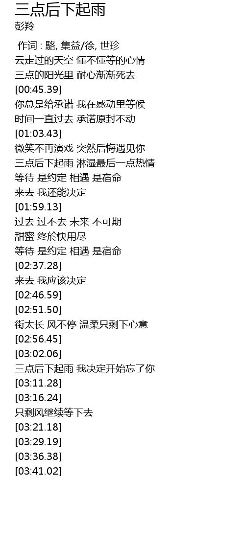 | [03:02.98] | 三点后下起雨 我决定开始忘了你 |