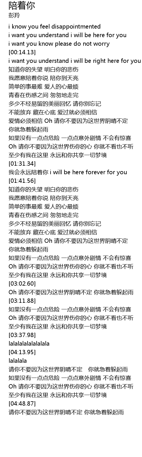 | [01:32.08] | wǒ huì yǒng yuǎn péi zhe nǐ i will be here forever for you |