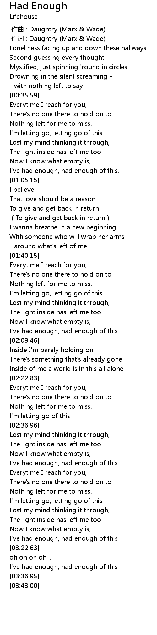 | [01:01.11] | I' ve had enough, had enough of this. |