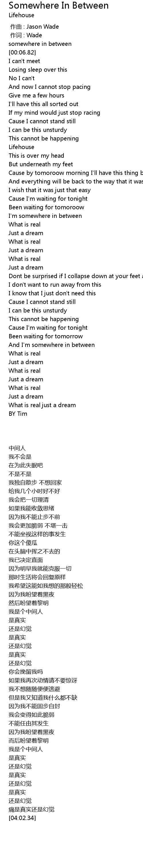 | [03:32.38] | And I' m somewhere in between |