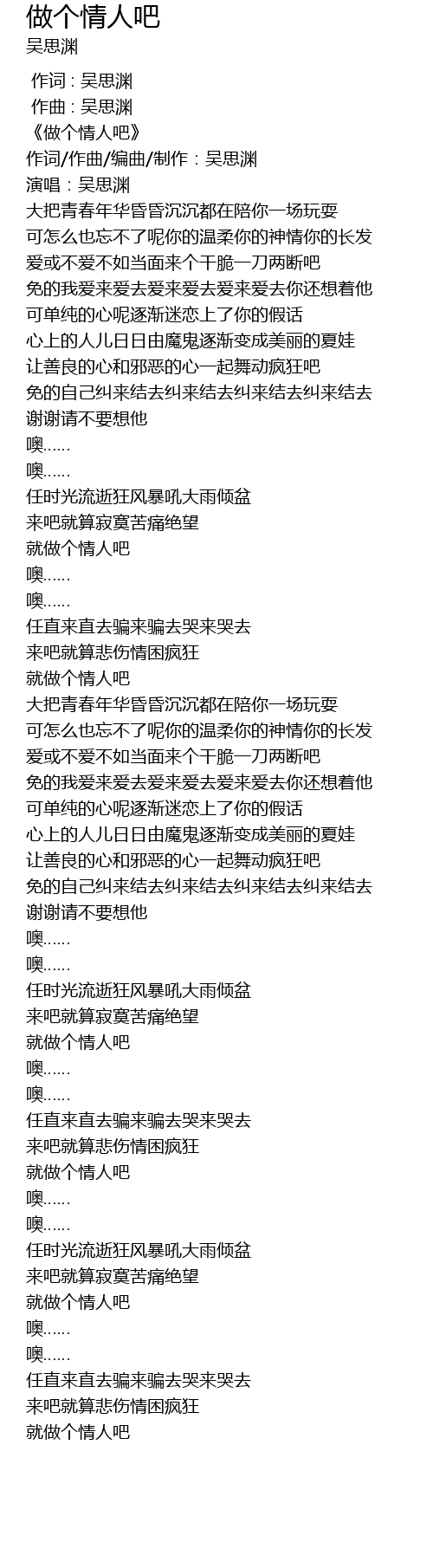 | [00:10.393] | 作词/作曲/编曲/制作:吴思渊 |