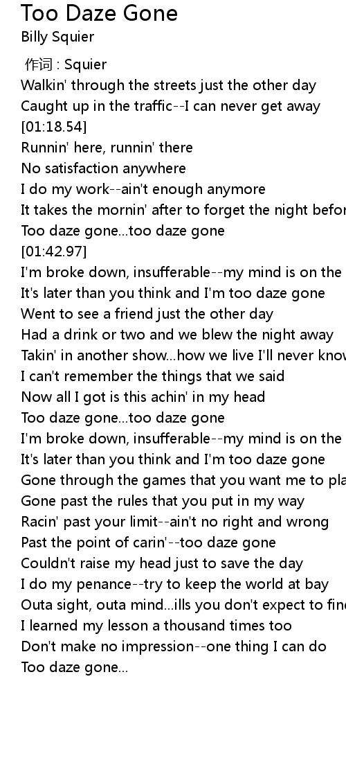 | [02:43.17] | It' s later than you think and I' m too daze gone |