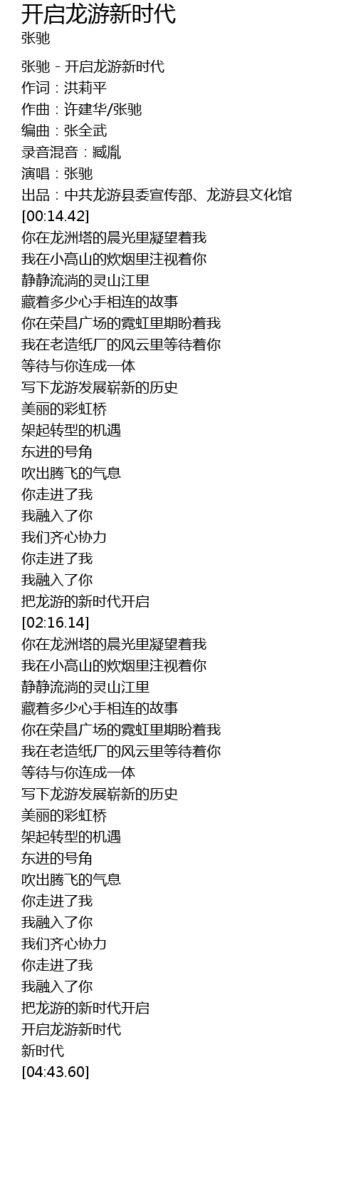 | [00:00.95] | 张驰 - 开启龙游新时代 |