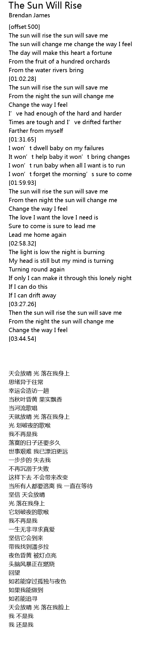 | [00:34.14] | The sun will rise the sun will save me |