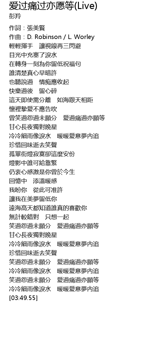 | [03:30.95] | 笑過怨過未願分 愛過痛過亦願等 |