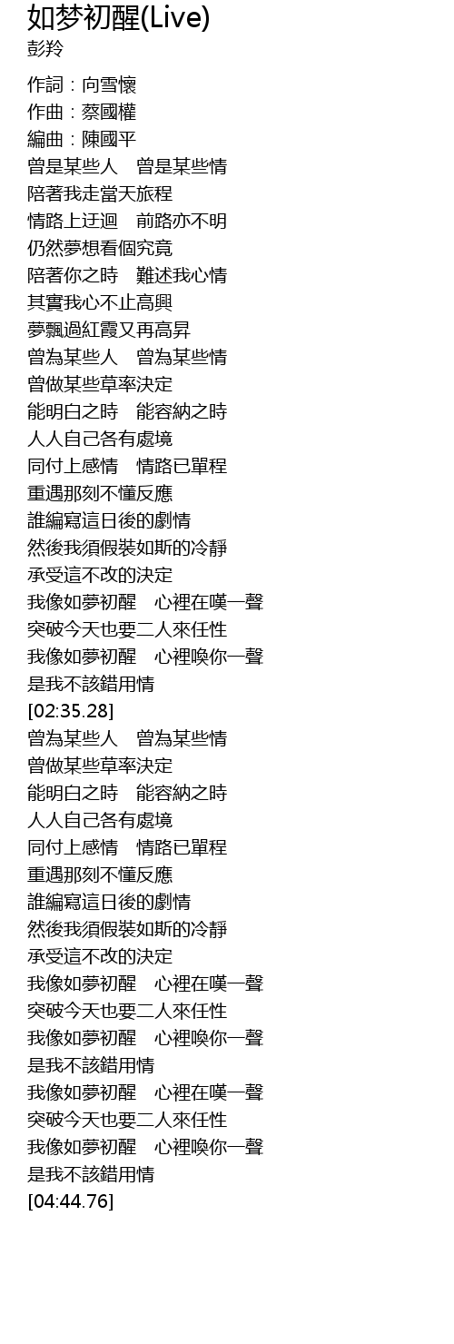 | [04:28.24] | 我像如夢初醒 心裡喚你一聲 |