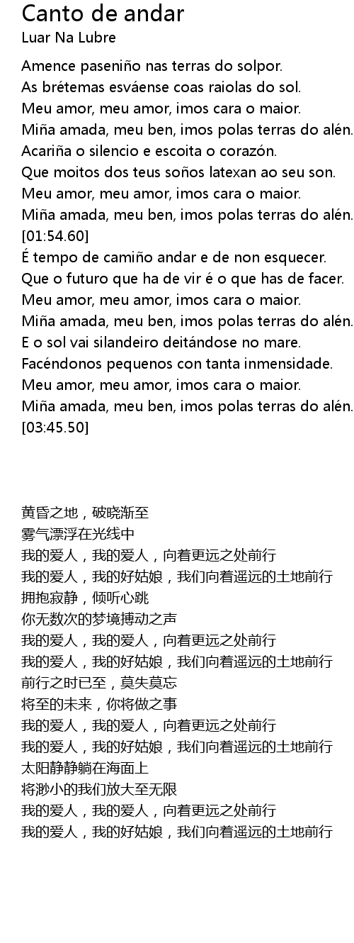 | [02:31.80] | É tempo de cami o andar e de non esquecer. |