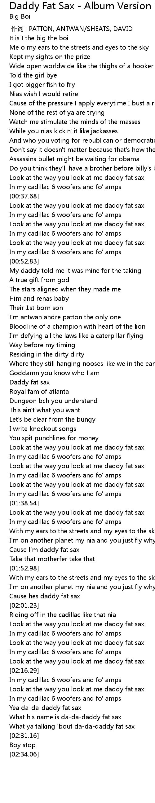 | [02:28.84] | What ya talking ' bout dadadaddy fat sax |