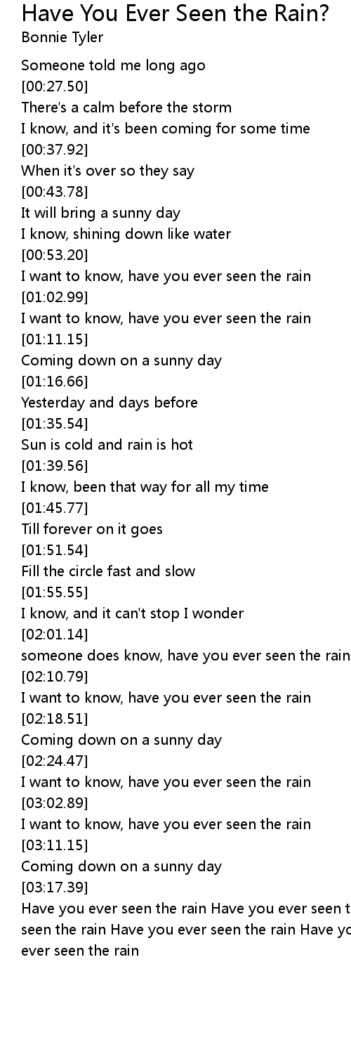 [03:24.80] Have you ever seen the rain Have you ever seen the rain Have you ever seen the rain Have you ever seen the rain Have you ever seen the rain Have you ever seen the rain