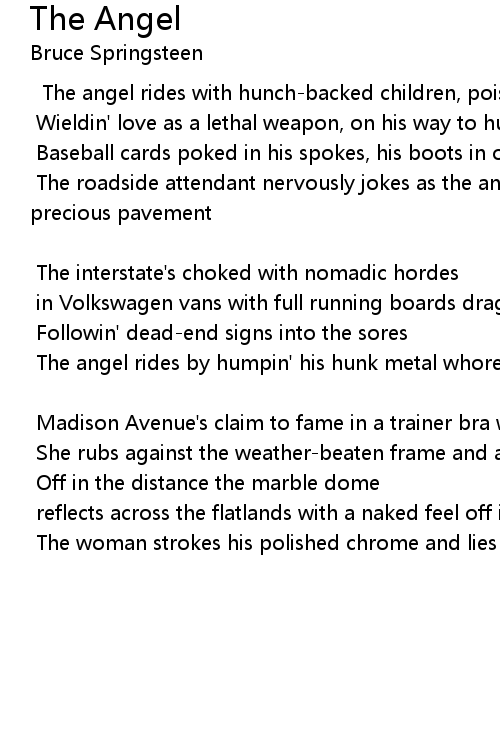 The angel rides with hunch-backed children, poison oozing from his engine |