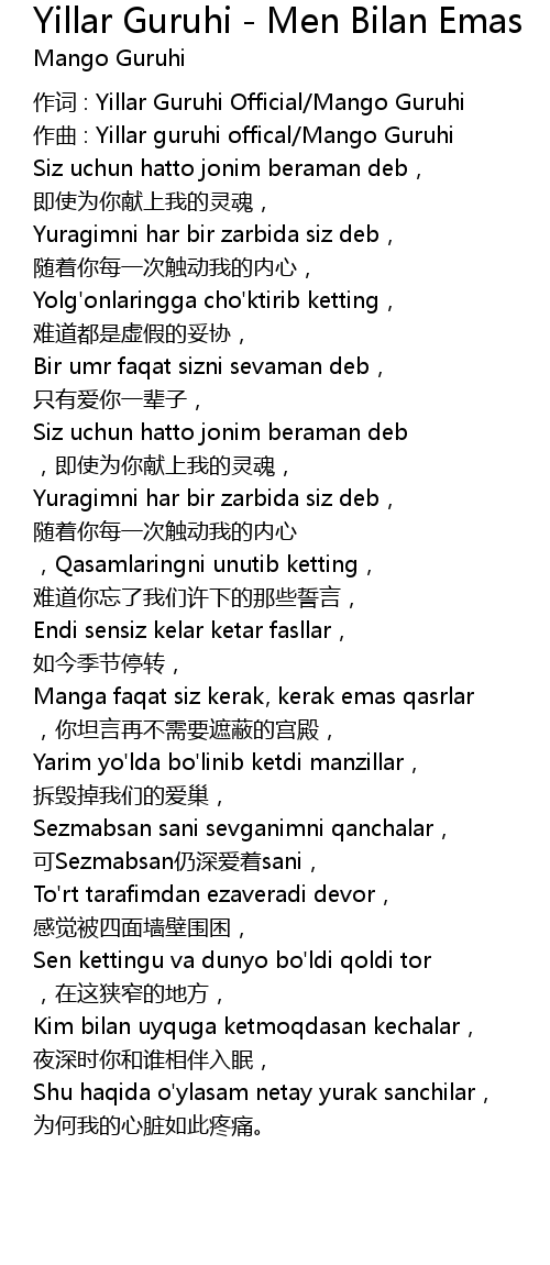 | 作词 : Yillar Guruhi Official/Mango Guruhi | |