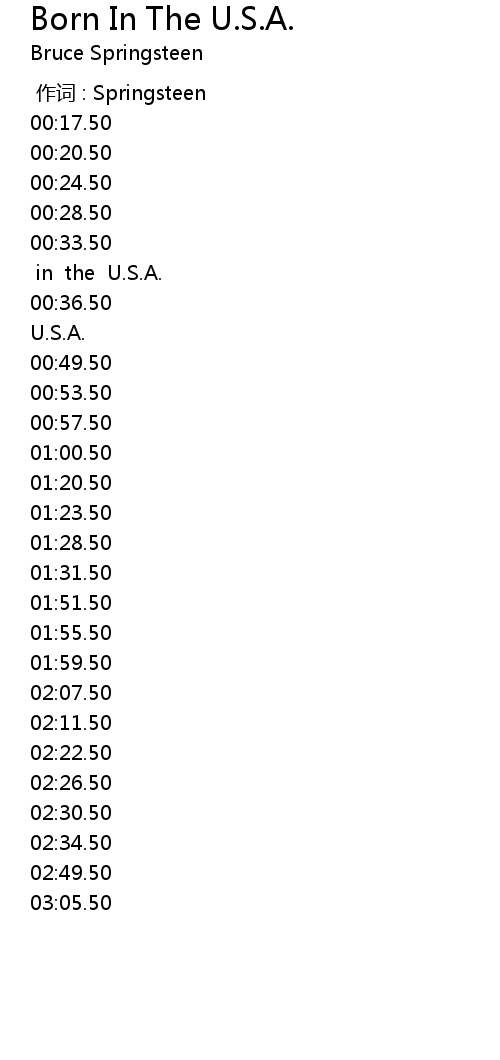 | [00:37.50]00:36.50]00:40.50]01:08.50]01:16.50]02:42.50] | I was born in the U.S.A. |
