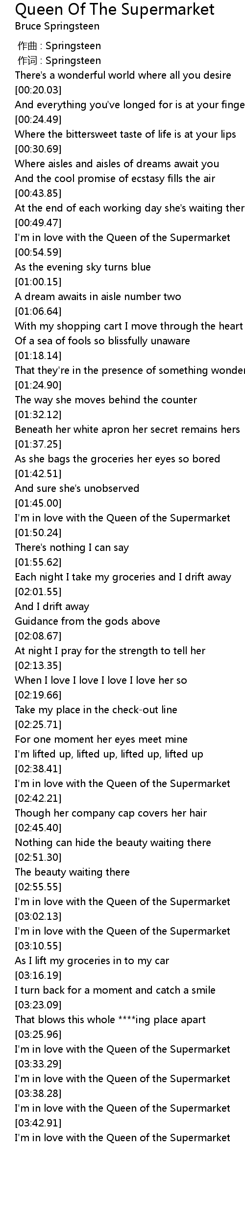 | [00:51.29] | I'm in love with the Queen of the Supermarket |