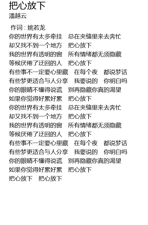 | [03:33.26] | 如果你觉得好累好累 把心放下 把心放下 把心放下 |