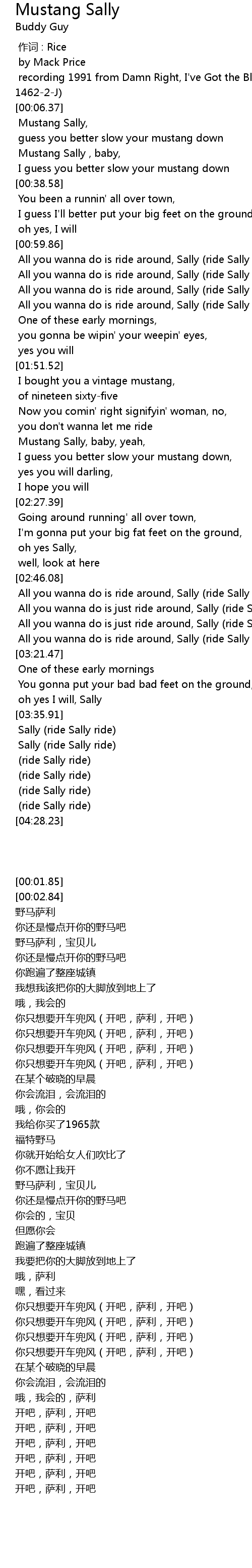 | [02:11.18] | Mustang Sally, baby, yeah, |
