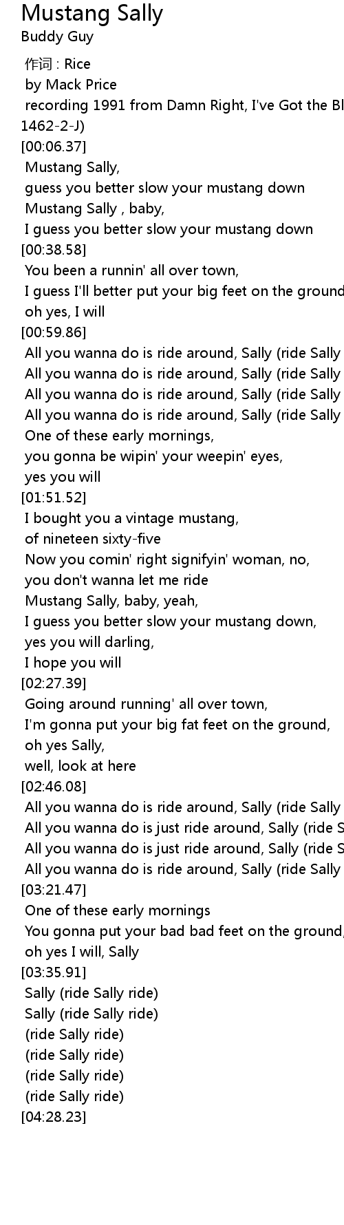 | [02:11.18] | Mustang Sally, baby, yeah, |