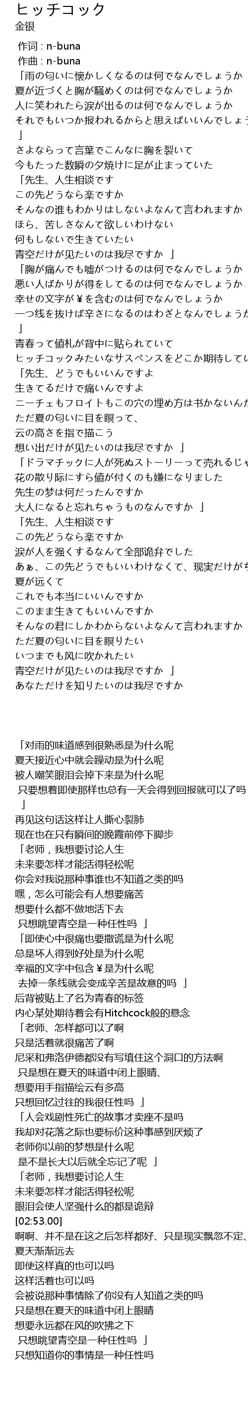 | [01:54.00] | ニーチェもフロイトもこの穴の埋め方は书かないんだ |